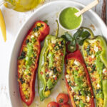Pointed pepper filled with fregola, mango, feta and spinach yogurt