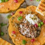 Cuando las lentejas estén cocidas, escurrir por un colador. Retire la calabaza del horno. Repartir las lentejas encima la calabaza. Echar el yogur y rociar con el aceite de hierbas. Adorne con cilantro picado o cebolleta y pepitas de granada.