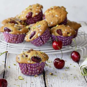 Hoy comparto con vosotros una receta de magdalenas veraniegas afrutadas. Muffins con cerezas frescas, pistachos y lima. Estos muffins son deliciosos para el desayuno, el brunch o como postre. Nosotros los comimos calentitos con una bola de helado de vainilla y ¡estaban realmente deliciosos!