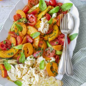 Trefwoord: zomerse salade, Mozzarella, abrikozensalade, salade, salade met abrikoos en perzik