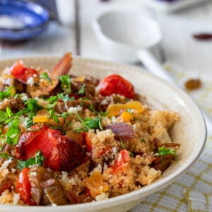 Op zoek naar een smaakvol en makkelijk couscoussalade recept? Deze couscoussalade met geroosterde aubergine en kerstomaatjes zit boordevol kruiden, zachte texturen en een verrassende zoete toets. Een kleurrijk gerecht dat perfect is als vegetarische lunch, lichte maaltijd of als bijgerecht op een zomerse BBQ.